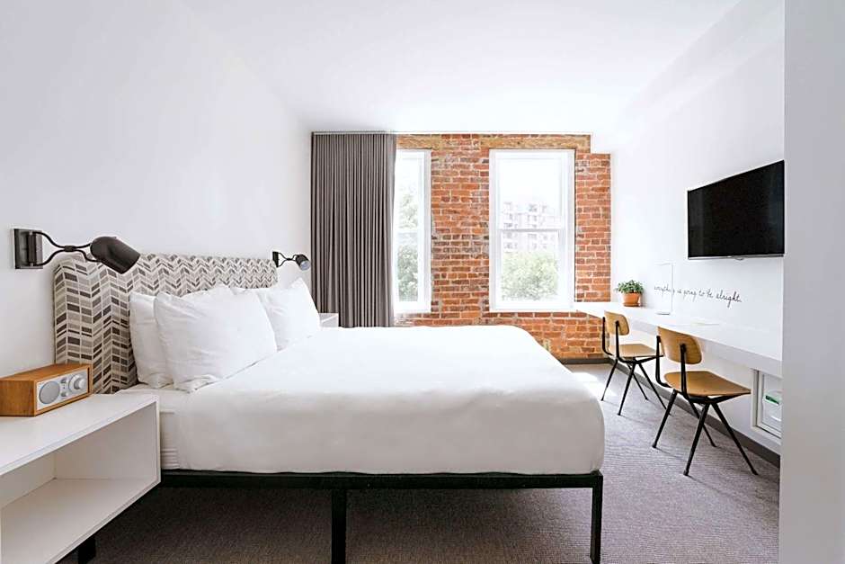 Located on the top floor, this room features a queen bed, individually controlled air conditioning, high ceilings, rustic beams and exposed brick.
